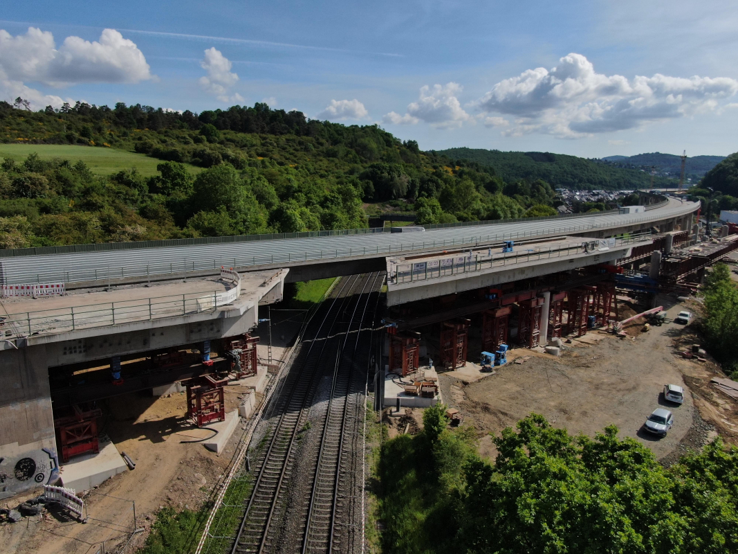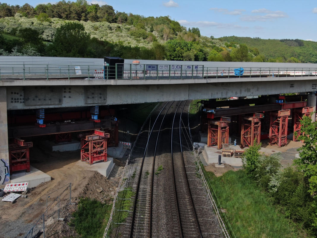 Verschubarbeiten Teilbereich BrückenüberbauRückbau der Talbrücke SechsheldenDie Talbrücke Sechshelden an der A45 wird im Rahmen des sechsspurigen Ausbaus vollständig ersetzt. Die bestehenden Spannbetonbauwerke, einschliesslich Pfeiler und Widerlager, werden zurückgebaut und durch neue Spannbeton-Hohlkästen ersetzt. Ein wichtiger Meilenstein im Rückbau wurde am Wochenende vom 17. bis 18. Mai 2025 erreicht: Wir haben ein 1‘400 Tonnen schweres Bauteil mit einer Länge von 62 Metern und einer Breite von 10 Metern erfolgreich über die Gleisanlagen der Deutschen Bahn verschoben. Die Arbeiten erfolgten im Rahmen einer exakt geplanten Bahnsperrpause und konnten innerhalb des engen Zeitfensters präzise umgesetzt werden. Unsere Verschubarbeiten markieren einen entscheidenden Schritt im Rückbau der Brücke und verdeutlichen, wie komplexe Ingenieurleistungen termingerecht und sicher umgesetzt werden können. Equipment Seite Ost:
